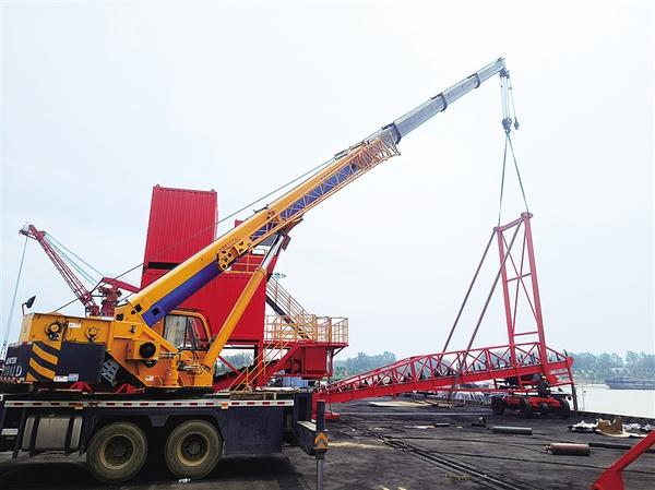 麦收过后,作为大宗粮食物流贸易集散地,周口中心港范营作业区将迎来货运高峰期。为确保港口高效运行,临港开发区码头运营办积极组织物流贸易企业在码头现场收粮、现场装船;通过与南方粮食交易市场合作,密切关注粮价动态,分析行情走势,开拓下游市场,确保市场秩序良好、农民收益向好。图为5月27日,工人们在周口中心港范营作业区安装传输设备。记者 宋风 摄