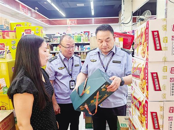 端午节前夕,为保障节日期间食品安全,周口市市场监管局港航分局对辖区超市销售的散装粽子、咸鸭蛋等传统节令食品开展检查。图为执法人员在超市检查食品标签标识是否规范。记者 宋风 通讯员 王燕 摄