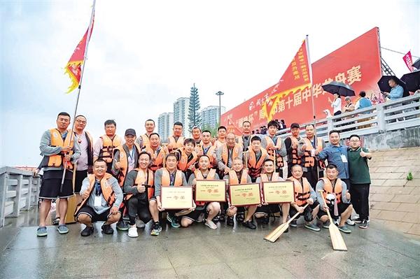 5月31日,2025“国缘杯”周口市第十届中华龙舟赛在雨中落下帷幕,市城乡一体化示范区代表队在100米、300米直道竞速项目中取得优异成绩。图为参赛人员合影留念。 记者 姬慧洋 通讯员 张一新 摄