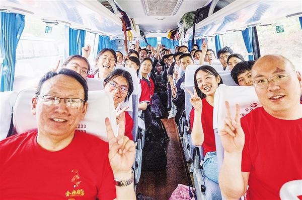 6月6日,在山东省荣成市第二中学,高三考生乘坐“爱心送考专线”前往各考点熟悉考场环境。