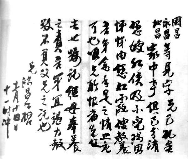 1934年11月24日,吉鸿昌就义前给兄弟写下遗书。遗书内容:“国昌、永昌、加昌等:见字兄已死矣,家中事俱已分清,您嫂红侠(霞)及小儿鸿男、悌悌由您红霞嫂教养。吾弟念手足之情照应可也。唯兄所恨者先父去世嘱托继母奉养之责,吾弟宜竭力教(孝)敬,不负父兄之托也。兄吉鸿昌书。”