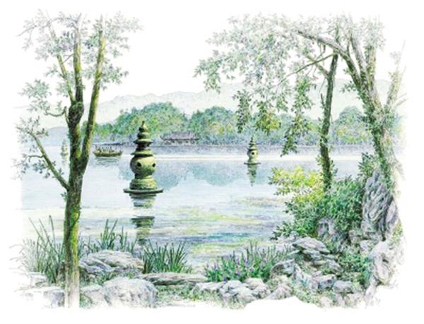 在一个周末的清晨,我携画具前往西子湖畔寻找灵感。漫步至九曲桥时,我被眼前的一幕所吸引:平静的湖面被游船犁出一条长长的轨迹,在阳光下闪闪发亮;岸边树木姿态各异,枝叶在微风中轻摆,与驳岸的太湖石交相辉映,层次分明;远处山峦与楼阁的轮廓在晨霭中若隐若现,与近处的实景相得益彰,宛如一幅天然的水墨画卷。