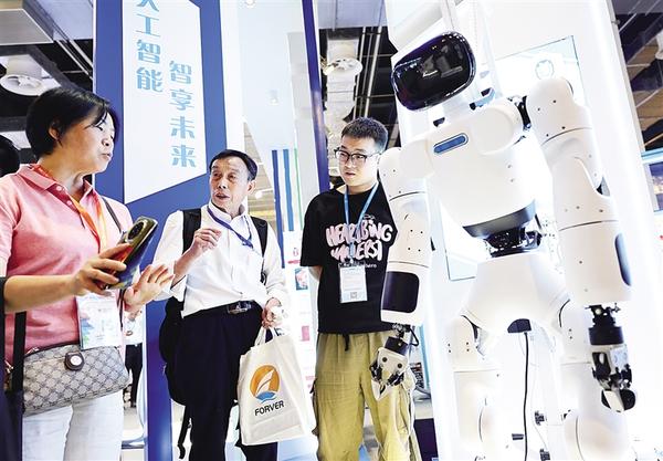 6月11日,参观者在一个人形机器人旁交流讨论。 当日,以“开放合作:赋能新质生产力与可持续发展”为主题的第十一届中国(上海)国际技术进出口交易会在上海世博展览馆开幕。本届上交会围绕人工智能等产业新赛道和技术贸易新兴领域,设置商用密码与数智制造、绿色能源与储运、智能海洋工程与装备、消费与商业科技4个专业技术展区,技术交易服务和技术交易促进活动2个功能区域,总展出面积为3.5万平方米,汇聚了来自近20个国家和地区及全国20个省(区、市)的创新成果,参展企业近千家。 新华社记者 方喆 摄