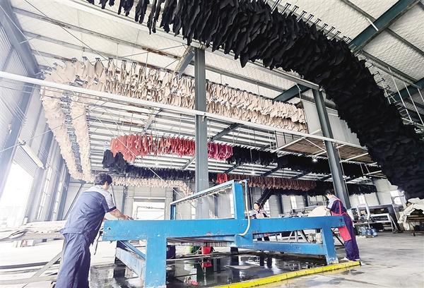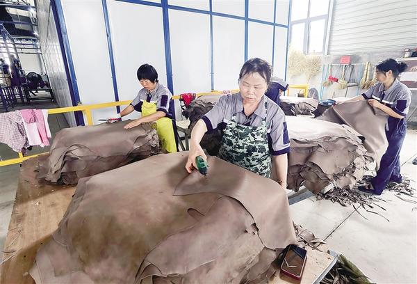 项城市华宝皮革产业园是集皮革加工、皮具成品制造、食品原料供应、再生革生产于一体的现代化农业产业化项目。主要产品涵盖沙发革、汽车座套革、箱包革、皮革生物胶原蛋白、再生革等,年产值达 6 亿元,是项城市皮革循环经济领域的龙头企业之一。图为皮胚生产车间里,工人正在加工生产皮料。