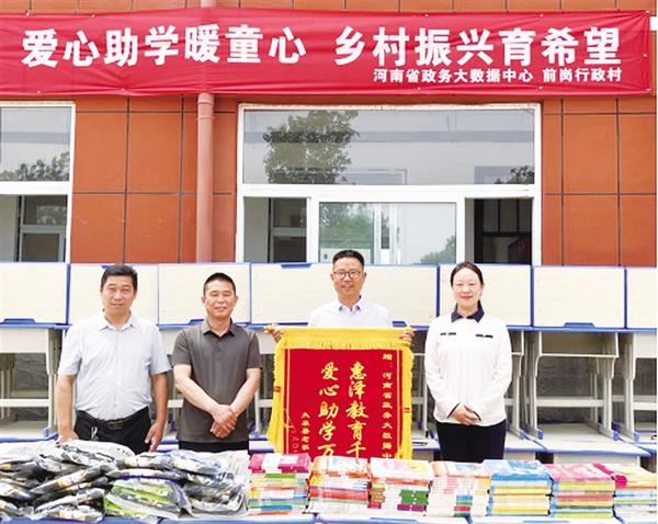 近日,河南省政务大数据中心工作人员到定点帮扶村太康县老冢镇前岗行政村开展“爱心助学暖童心 乡村振兴育希望”慰问活动,向前岗行政村小学捐赠价值2万余元的爱心物资,以实实在在的关怀助力该村儿童健康成长。图为河南省政务大数据中心工作人员收到前岗行政村小学回赠的锦旗。记者 张洪涛 摄