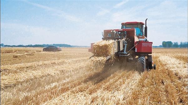 近年来,太康县积极探索秸秆综合利用新路径,引进秸秆打捆机、粉碎机,推行秸秆打捆离田、粉碎还田,不仅帮助农民解决了秸秆处理难题,还拓宽了农民增收渠道。图为麦收结束后,一台秸秆打捆机在田间作业。记者 张洪涛 摄