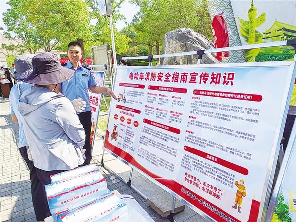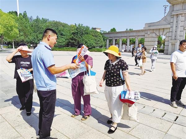 6月16日上午,市城乡一体化示范区安全生产和防灾减灾救灾委员会组织18家成员单位,在周口公园开展“安全宣传咨询日”活动,通过多种形式,向群众普及安全知识,有效增强群众的安全意识和应急处置能力。小图为工作人员向群众发放宣传资料。大图为工作人员向群众讲解安全知识。记者 姬慧洋 摄