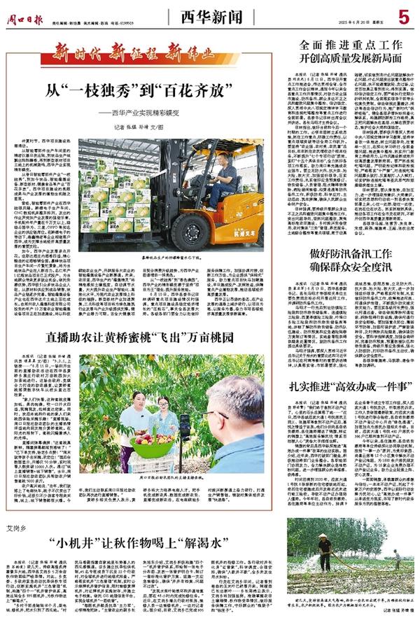 本报讯 (记者 张猛 孙靖 通讯员 理真真 文/图) “3、2、1,上链接……”6月11日,一场别开生面的直播助农活动在西华县黄桥乡裴庄行政村万亩桃园如火如荼地进行。这场由政府、党媒合力打造的助农盛宴,让黄桥蜜桃搭乘数字快车从枝头直达百姓家。
