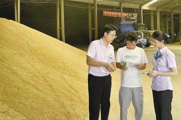 近日, 农行周口分行聚焦“三夏”关键节点,以“惠农e贷”等金融产品为抓手,及时足额发放“三夏”生产资金,为打赢夏收“攻坚战”贡献金融力量。图为该行客户经理向收粮大户介绍金融产品。 杨高杰 张继平 摄