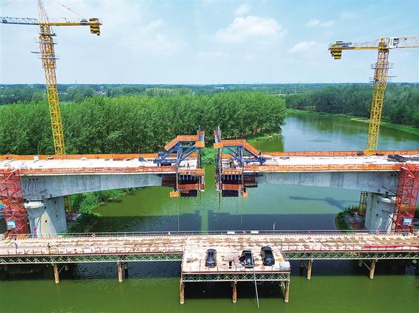 6月30日,中铁七局的工人正在平漯周高铁周口段跨颍河大桥上施工。平漯周高铁周口段跨颍河大桥是中铁七局在周口境内施工的三条跨河桥梁之一,于2023年动工,桥长416米,预计本月底合龙。