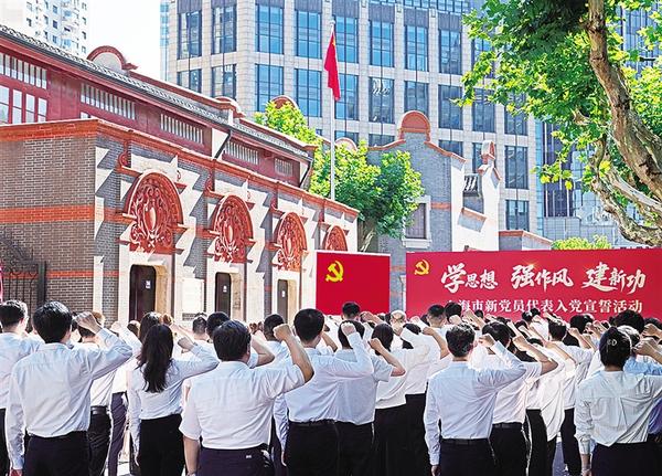 7月1日,上海市新党员代表入党宣誓活动在中共一大会址前举行。 当日,中共一大纪念馆举办“颂歌献给党”系列庆祝活动,以庄严仪式、文艺汇演、红色体验相结合的形式,庆祝中国共产党成立104周年。 新华社记者 刘颖 摄
