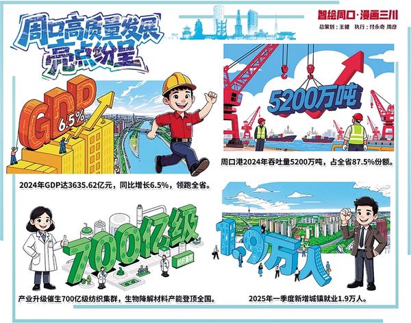 “两高四着力”,三川谱新篇。去年以来,周口高质量发展答卷亮眼:2024年GDP达3635.62亿元,同比增长6.5%,增速领跑全省;工业增加值增长10.1%,高技术产业以38.9%的增速强势崛起,国家级高新技术企业达138家。港口经济表现抢眼,周口港2024年吞吐量5200万吨,占全省总量的87.5%,14条国际航线构筑开放新格局。治理效能显著提升,“万人助万企”活动推动工业投资增长26.5%;产业升级形成700亿元级纺织集群,生物降解材料产能登顶全国。民生保障方面,2025年一季度新增城镇就业1.9万人,绿色印染产业园领跑全省。文化建设方面,通过科普巡讲、非遗保护、乡村文化合作社建设等举措,推动科学素质与传统文化双提升,书写文化繁荣新篇章。从经济跃升到民生改善,从港口开放到文化兴盛,周口正以多维突破树立豫东高质量发展标杆。