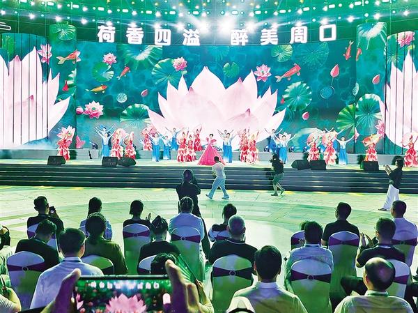 7月9日晚,第四届周口荷花节暨文旅消费季启动仪式在淮阳伏羲文化广场举行。广大群众共同欣赏精彩纷呈的文艺演出。