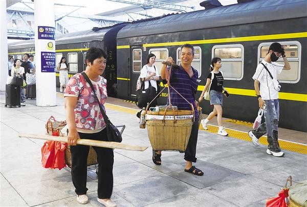 7月9日,在黎湛铁路玉林站,卖完水果的果农准备乘坐火车回家。 早上挑着水果搭火车跨省区销售,晚上搭火车回家……时下正是广东、广西水果收获季节,果农挑着箩筐,推着小车借助穿越两省区的黎湛铁路绿皮火车,跨省区售卖水果,成为暑运一道独特的风景。 黎湛铁路线上的绿皮客运列车票价实惠,停靠车站多。多年来,铁路部门在车站设置了专门候车区,铁路工作人员常为挑重担的果农搭把手、帮个忙,为果农售卖水果提供便利。 新华社记者 陆波岸 摄