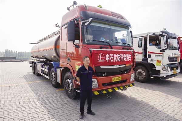 中石化周口石油分公司组建防汛应急队伍,调配防汛专用车及专业装备参与演练。