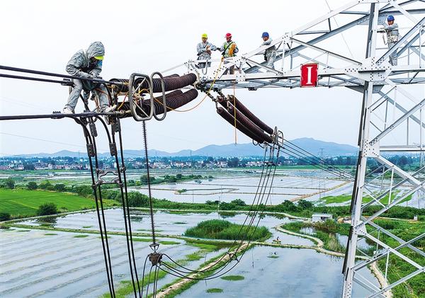 连日来,安徽迎来持续高温天气,电力保供进入“迎峰度夏”关键期。在三峡水电外送大动脉之一的±500千伏龙政线安徽马鞍山段,检修人员在日常巡护中发现一处导线耐张线夹存在异常发热情况,已构成危急缺陷,威胁该线路安全稳定运行。“00后”王庆闵在师傅吴维国的指导下,和同事一起冒着高温,在30米高的铁塔上对该缺陷部位开展精准“手术”,经过约2小时的作业,最终排除隐患,确保“西电东送”关键能源通道的安全稳定运行。