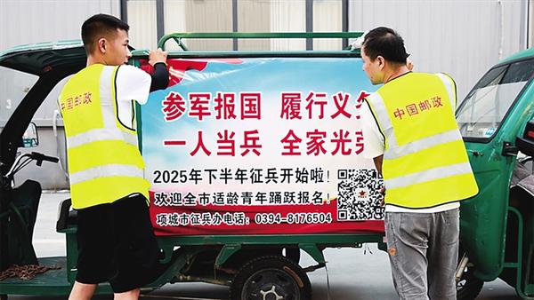 7月8日上午,项城市邮政物流中心30多名快递员将印有“参军报国 履行义务 一人当兵 全家光荣”字样的征兵海报张贴在快递车厢两侧,随后穿梭在城市的大街小巷,将征兵信息传递到千家万户。据了解,2025年下半年征兵工作开始以来,项城市人民武装部借助快递等民生服务渠道开展征兵宣传,既拓宽了宣传覆盖面,又增强了宣传针对性。 记者 张志新 通讯员 孔伟 摄