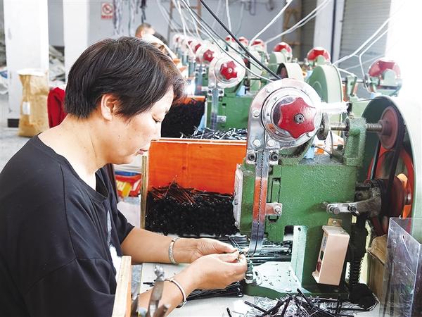 沈丘县人大常委会引导基层人大代表充分发挥“能人”优势,创新建立“人大代表+合作社+企业+农户”发展模式,带领群众发展来料加工、特色种植、特色养殖等产业,激发群众主动参与产业发展的内生动力,持续推进乡村振兴。图为7月16日,付井镇一处来料加工车间内,工人正在加工伞骨。