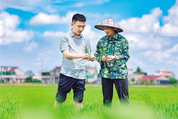 7月22日,农技人员和农民在江苏省南通市通州区东社镇严北村的田间查看水稻生长情况。