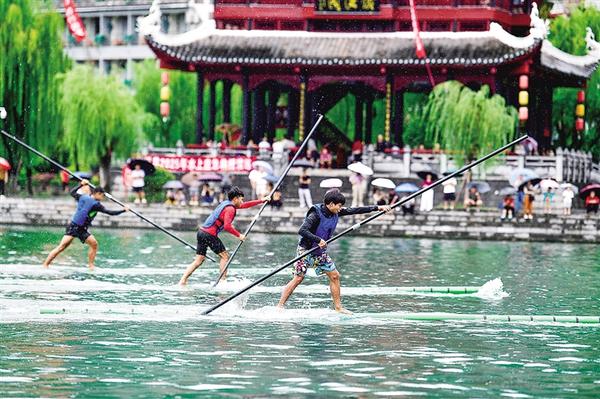 7月23日,参赛队员在贵州省镇远县氵舞 阳河上进行独竹漂比赛。 7月22日至23日,2025年民体杯全国独竹漂比赛在贵州省黔东南苗族侗族自治州镇远古城举行,来自浙江、湖北、广西、广东、贵州等省(自治区)的10支独竹漂代表队参加比赛。 新华社记者 杨文斌 摄