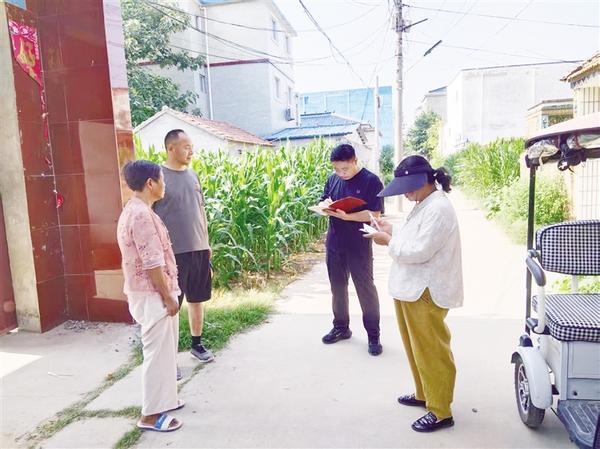 近日,淮阳区医疗保障局工作人员(右一、右二)走进鲁台镇花庄行政村,向群众宣传医保政策。