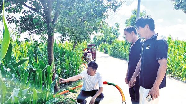 7月26日早上7时许,戚亚威父子拉着水管来到地头,他们看着叶片低垂的玉米眉头紧锁,不时发出叹息声。就在此时,几个人骑着电动车向他们驶来。定睛一看,戚亚威认出领头的是驻村第一书记刘会见,其余几名是乡政府组织的党员志愿者。