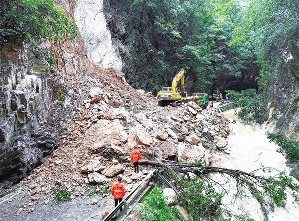 近日,受持续强降雨影响,湖北省襄阳市保康县境内多条道路出现险情,交通受阻,保康县交通公路部门迅速开展抢险保通工作,截至10日下午4时,保康县境内国省干道和县乡道路全部恢复通行。 新华社发(陈泉霖 摄)
