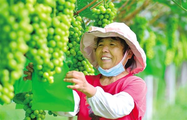 日前,位于郸城县钱店镇的尚葡农业科技园内硕果累累,精细化管理带来葡萄大丰收。图为一名工作人员看着即将收获的葡萄笑逐颜开。 柴元红 摄
