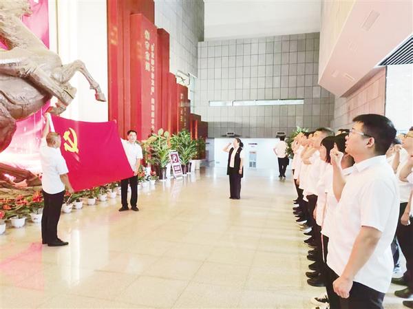 当日上午,在吉鸿昌纪念馆,参加活动的全体党员站在吉鸿昌将军铜像前,面向庄严鲜艳的党旗,举起右手,庄重宣誓:“我志愿加入中国共产党,拥护党的纲领,遵守党的章程,履行党员义务、执行党的决定……” 他们用铿锵有力的誓词表达了对党无限忠诚的信念。面对鲜艳的党旗,他们心中油然而生的是爱国情怀和作为新时代共产党员神圣的责任感和使命感。在讲解员引导下,他们通过参观实物展品、历史照片和文字史料,重温了吉鸿昌将军“恨不抗日死,留作今日羞”的爱国壮举,感受其“做官即不许发财”的清廉操守和革命气节。
