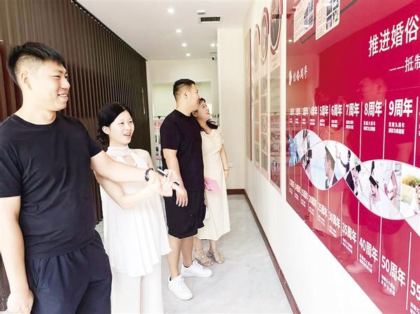 近年来,沈丘县加大精神文明建设力度,通过举办文化大讲堂等活动,在广大群众中形成“天价彩礼不可取,铺张浪费最可耻,陈规陋习危害大”的共识,许多年轻人在耳濡目染中受到熏陶,新事新办蔚然成风。图为8月29日,农历七月初七,结婚登记的新人在婚史展板前驻足。