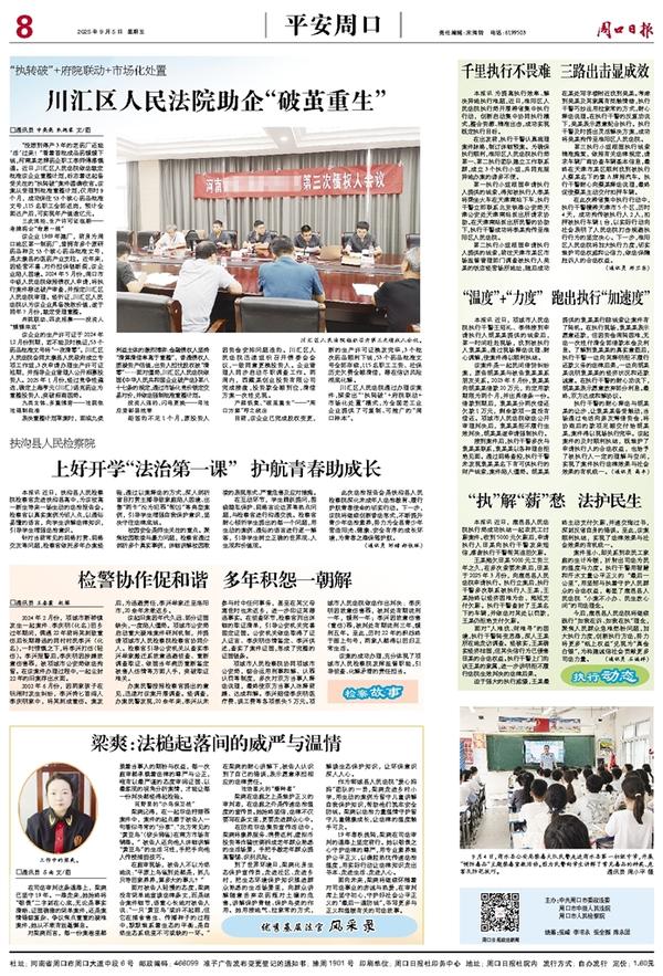 本报讯 近日,项城市人民法院执行干警王冠礼、李伟接到申请执行人胡某某提供的线索后,第一时间赶赴现场,找到被执行人袁某某,通过现场释法说理、耐心调解,使案件得以顺利执结。