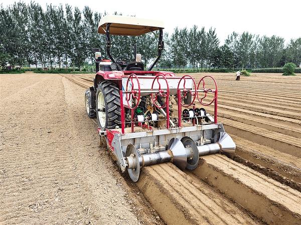 9月4日,在淮阳区临蔡镇吴金锋家庭农场种植基地,一台集旋耕、施肥、起垄、播种于一体的北斗导航农业机械正在播种萝卜。据了解,使用这种设备播种,可大幅提高播种效率。
