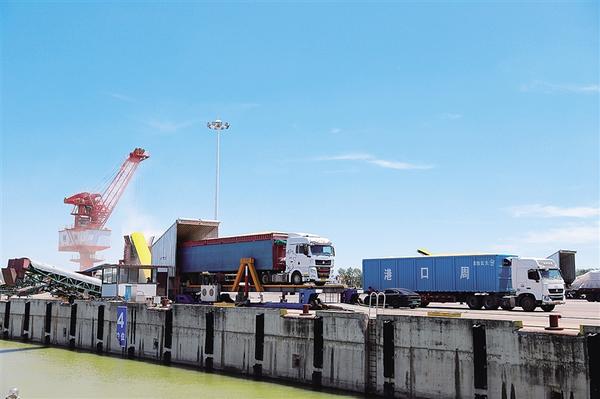 今年1月至7月,周口中心港范营作业区大宗商品交易额突破41亿元大关。图为集装箱卡车在码头作业。记者 宋风 摄