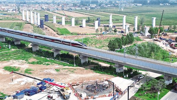 9月15日上午,中铁十局的工人正在安装转体桥上承台钢筋,为浇筑做准备。位于周口太清路的平漯周高铁转体桥经过5个月的地下基础施工,目前转入地面以上桥墩结构施工。该转体桥长200米,上跨郑阜高铁和太清路,是平漯周高铁全线工程中跨路最多、箱梁最长、施工难度最大、技术要求最高的转体桥。记者 梁照曾 摄