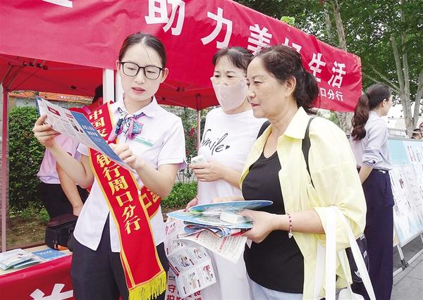 9月16日,农行周口分行在五一文化广场开展以“保障金融权益 助力美好生活”为主题,由国家金融监管总局周口监管分局组织的2025年“金融教育宣传周”活动。图为该行工作人员向群众讲解非法金融活动的特点。 程飞帆 王卫华 摄