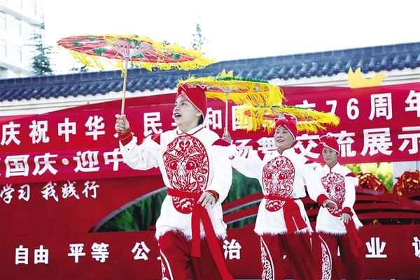 9月25日,在河南省洛阳市汝阳县刘伶广场,汝阳县牡丹艺术团在表演陕西大秧歌《红歌大联唱》。
