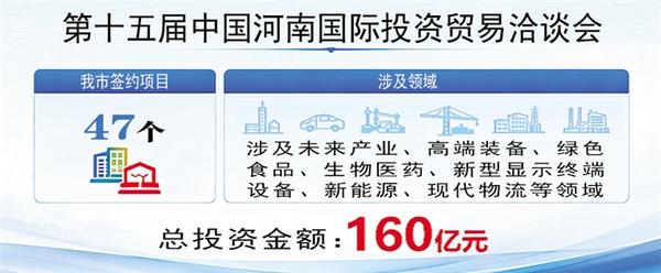 本报讯 (记者 李凤霞 王永剑) 9月26日,我市在第十五届中国河南国际投资贸易洽谈会上,共签约项目47个,涉及未来产业、高端装备、绿色食品、生物医药、生物经济、新型显示终端设备、新能源、现代物流等领域,总投资金额160亿元。