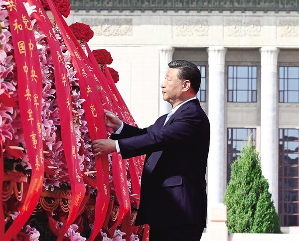 习近平迈步上前,仔细整理花篮缎带。随后,习近平等党和国家领导人缓步绕行,瞻仰人民英雄纪念碑。