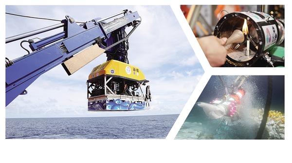 9月18日,在南海北部海域,我国自主研发的“海马”号深海遥控潜水器(ROV)搭载“可燃冰原位采集分解及引燃装置”下潜到1500多米深海底,科研人员远程操控采集可燃冰,并降压使其分解,产生的甲烷气体即为“源火”气源。随后,科考船甲板面的太阳能光伏装置发电并传输到海底,引燃气源获取“源火”。“海马”号携带燃烧的“源火”返回科考船甲板面后,科研人员将“源火”转移至“源火”盒,“源火”采集成功。 新华社记者 卢汉欣 摄