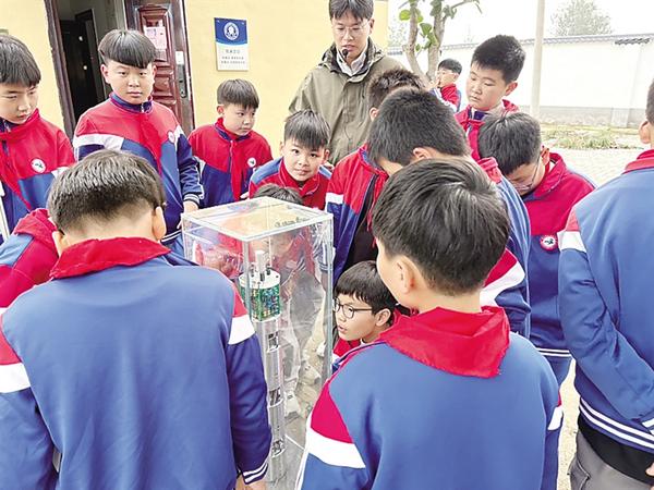 10月13日,在周口地震监测中心站,来自周口市中原路小学的学生将这里的工作人员围得水泄不通,一个个问题不断抛给工作人员,一堂生动的科普教学在这里上演。图为工作人员向学生讲解井下短期地震计的工作原理。