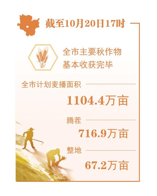 据农情调度,截至10月20日17时,全市除部分红薯、蔬菜、大豆等晚熟作物外,主要秋作物已基本收获完毕。全市计划麦播面积1104.4万亩,已腾茬716.9万亩,整地67.2万亩。②11