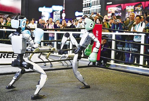 11月6日,在第八届进博会技术装备展区宇树科技展台,两台G1人形机器人的格斗表演吸引了众多观众。它们戴着护具及拳套,施展直拳、勾拳、左右鞭腿,展示倒地自主起身等复杂动作,不时赢得观众喝彩。据介绍,这款亮相表演的人形机器人身高132厘米,体重约35公斤。