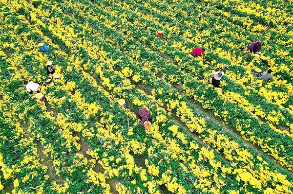 11月13日,项城市新桥镇南赵村村民在田间采摘金丝皇菊。刚刚离枝的新鲜菊花随即被送往村里的加工车间烘干,之后由专业合作社统一收购并对外销售。