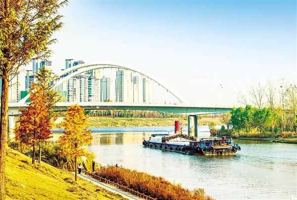 11月21日,天气晴朗,一艘货船从沙颍河中心城区段中原路大桥下缓缓驶过。