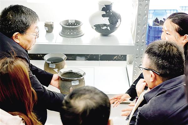 11月22日,2025夏文化论坛在周口淮阳举行。图为参加论坛的专家学者围绕淮阳朱丘寺遗址出土文物细节进行交流。记者 刘俊涛 王映 摄