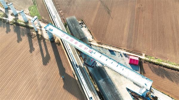 11月25日凌晨2时30分,平漯周高铁商周特大桥关键桥梁结构历经140分钟精准操控完美实现空中转体,标志着该高铁全线首个跨越正在运营高铁线路的转体工程顺利完成。据悉,商周特大桥是目前河南省内首个采用“无边跨”设计的转体桥,其关键桥段全长161.5米、重量约9925吨。图为一高速列车从大桥下平稳驶过。记者 刘俊涛 梁照曾 摄