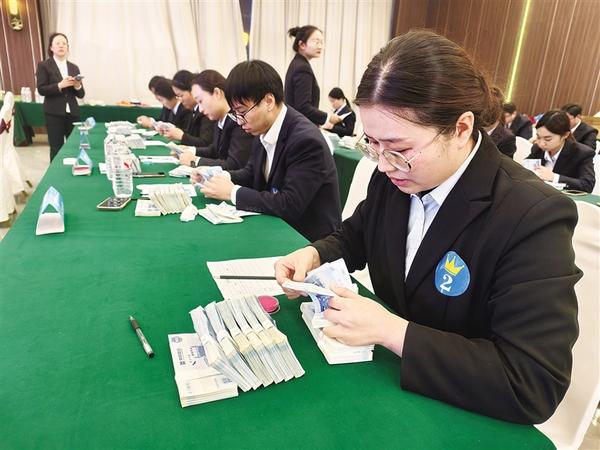 此次技能竞赛现场,参赛选手手法各异,单指如行云流水,多指若蝴蝶穿花,在“沙沙”的清脆声响中,成沓纸币被迅速点验、扎把、盖章。速度与精度在这里交织,展现出技艺锤炼的极致境界。