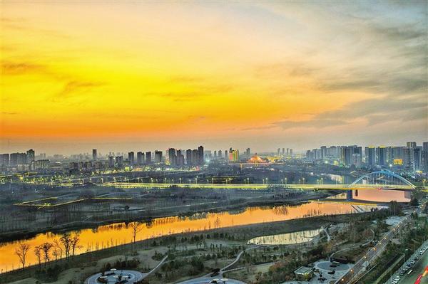 11月27日傍晚,夕阳的余晖洒在沙颍河上,城市处处流光溢彩,犹如一幅油画。