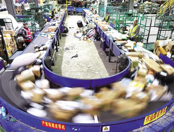 近日,中国邮政集团有限公司衡阳邮区中心局邮件处理中心,工作人员在工作线上分拣快递包裹(无人机照片)。
