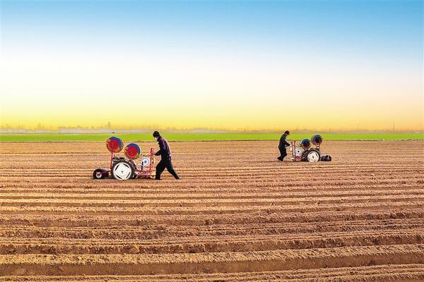 12月3日,扶沟县韭园镇农民迎着朝阳进行胡萝卜播种作业。该镇1000亩胡萝卜种植基地依托卫星定位技术完成土地深翻与起垄,并采用播种、滴灌铺管、播后镇压一体化机械进行播种,相比传统种植方式,作业效率显著提升,播种周期可提前5至8天。